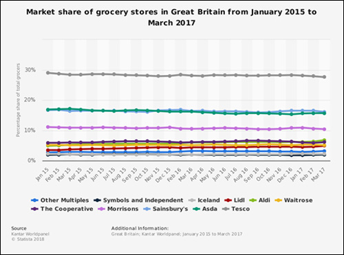 While Morrisons continue to go it alone and maintain a market share between 2016 and 2017 of a little over 10%, the other three chains have reacted by announcing high profile mergers, including the proposed coming together of Sainsbury’s and Asda in a £51 billion deal. Tesco, meanwhile, had already taken over the wholesaler Booker in a deal worth £4 billion, a move which put even more pressure on the other two to keep up.