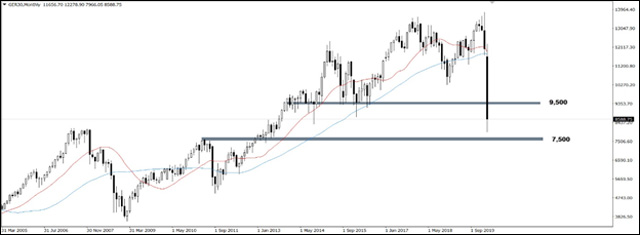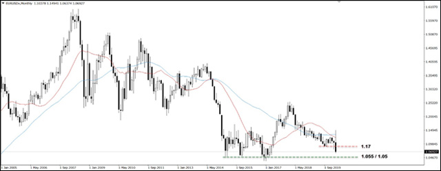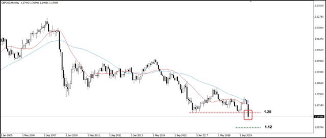 GBP/USD broke the major support levels of 1.20, and the bearish signal on the monthly chart below shows no sign of abating. This bearish setup and price action puts the level of 1.1 on the spot.