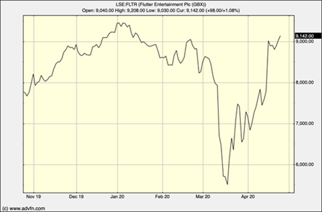 London-listed 888’s (LSE:888) chart follows a similar course as does Flutter Entertainment plc’s (the bookmaking holding company created by the merger of Paddy Power and Betfair) – LSE:FLTR.