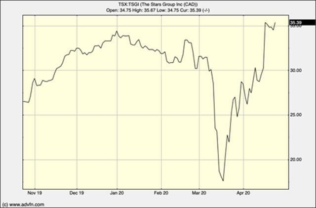 Unsurprisingly business for online gaming and gambling websites has increased since the introduction of lockdown. Canadian-based The Stars Group (TSX:TSGI) reported record revenue for the first quarter of 2020 as a result of rises in online poker and casino play. The company saw 27% year-over-year growth to US$ 735m (£592m). After a market-correlated sharp drop in the first part of March, it then saw its share price double in the space of a month.