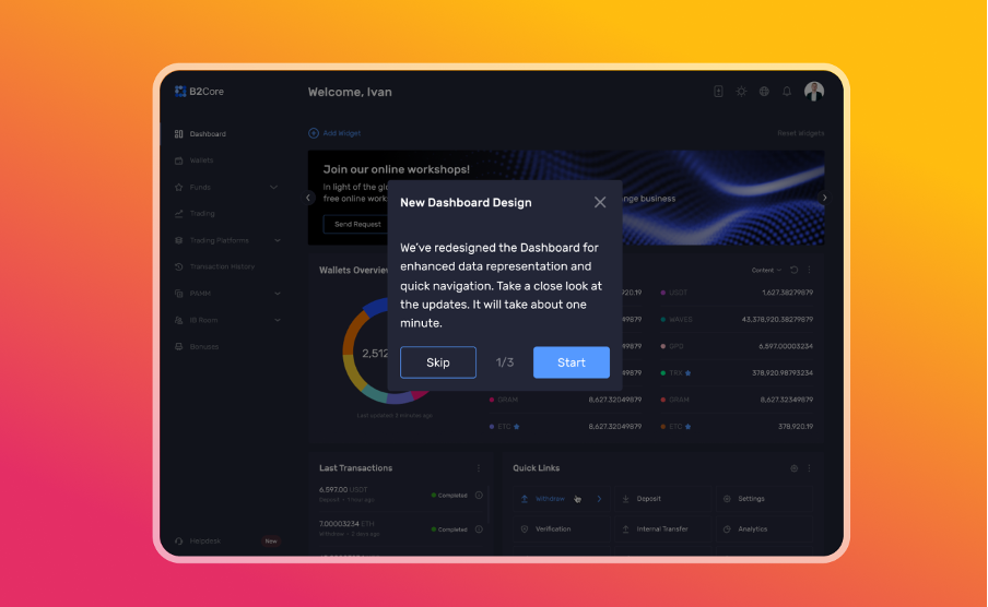 The B2Core Dashboard serves as a personalised command centre for its users. In the latest version, B2Core v4, a new left bar has been introduced that grants even greater control over the layout of the Dashboard. By adding widgets, users can easily access links, view information about their trading accounts, see relevant banners, and adjust their Dashboard to fit their needs.