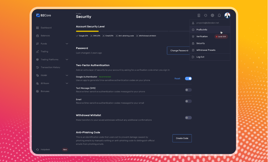The Profile area of B2Core v4 is now located in the header for quick access. It integrates user settings, a security module, and verification processes.