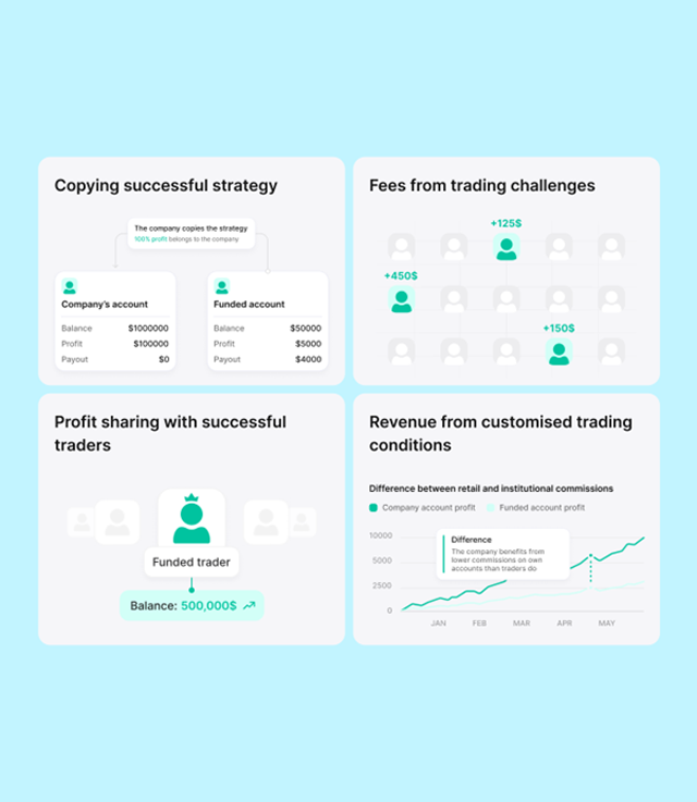 Therefore, to accommodate the growing demands for prop trading among traders and the increasing need for specialised software among brokers, B2Broker launched B2Prop, a powerful and sophisticated turnkey solution created to help businesses create and launch their proprietary trading firms from the ground up.