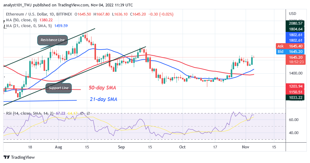 Ethereum (ETH) trades above the moving average lines as the altcoin revisits the resistance at $1,600. Buyers attempt to keep the bullish momentum and hold the price above the existing resistance. Once buyers surpass the $1,600 high, the bullish momentum will increase to highs of $1,800 and $2,019 in price. The resistance level has currently been retested and broken by buyers. If the bullish momentum continues, further gains are probably in store. If the largest altcoin declines from its recent high, it will find support at $1,550. At the time of writing, the price of ether is $1,648.70.