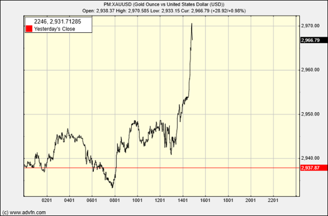The gold price (PM:XAUUSD) rose today to hit an all-time high of 2,970.74, surpassing its previous record high in February.