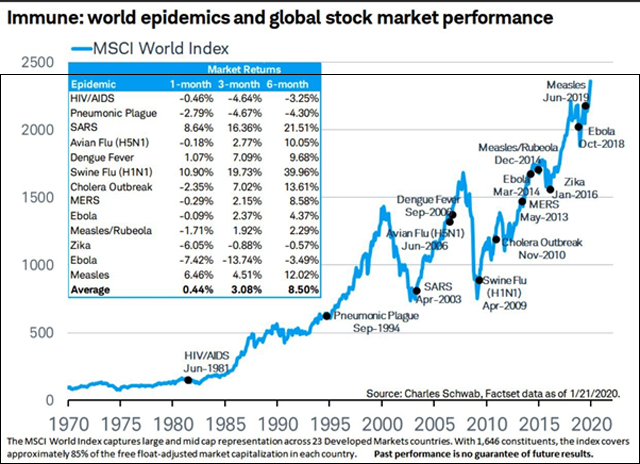 Charles Schwab elaborated a chart that shows the impact of past world pandemics has not been significant on the global stock market: