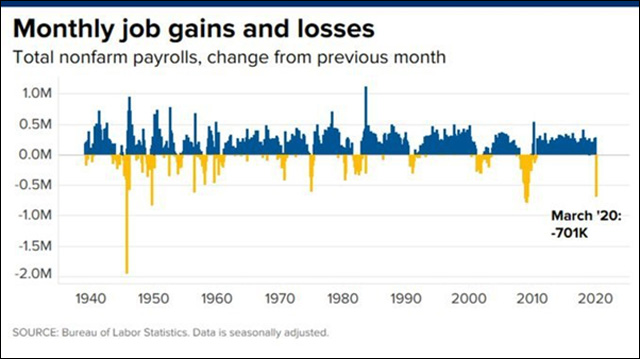 According to the U.S. Bureau of labor statistics, total nonfarm payroll employment fell by 701,000 in March, and the unemployment rate rose to 4.4 percent. Employment in leisure and hospitality fell by 459,000, mainly in food services and drinking places. Notable declines also occurred in health care and social assistance, professional and business services, retail trade, and construction. This is the largest over-the-month increase in the rate since January 1975, when the increase was also 0.9 percentage point. The number of unemployed persons rose by 1.4 million to 7.1 million in March.