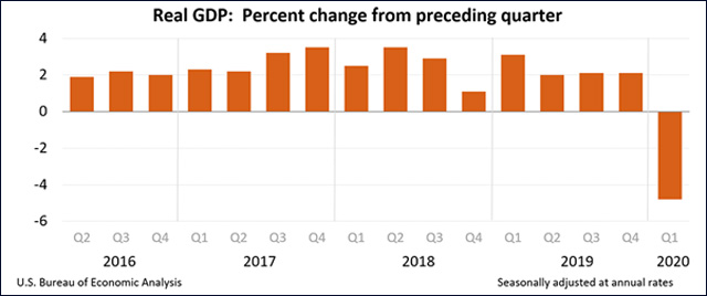 As expected, real gross domestic product (GDP) decreased at an annual rate of 4.8 percent in the first quarter of 2020. In the fourth quarter of 2019, real GDP increased by 2.1 percent. Current‑dollar GDP decreased 3.5 percent, or $191.2 billion, in the first quarter to a level of $21.54 trillion. In the fourth quarter, GDP increased by 3.5 percent, or $186.6 billion.