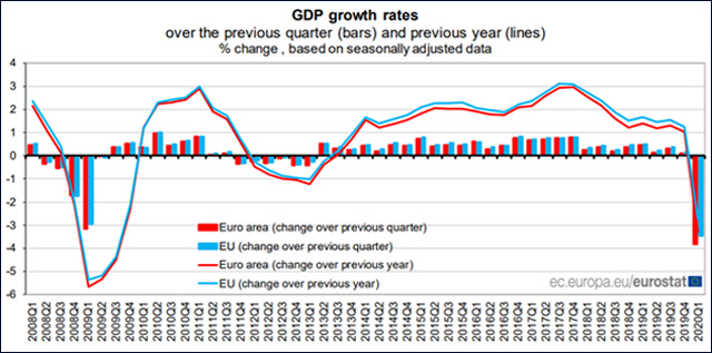 The eurozone economy contracted by 3.8% in the first quarter, compared to the last three months of 2019. France, on the other hand, entered a technical recession, contracting 5.8% in the first three months of 2020 vs last quarter of 2019.
