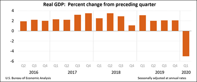 Real gross domestic product decreased at an annual rate of 5.0 percent in the first quarter of 2020, according to the “second” estimate released by the Bureau of Economic Analysis. In the fourth quarter, real GDP increased by 2.1 percent.