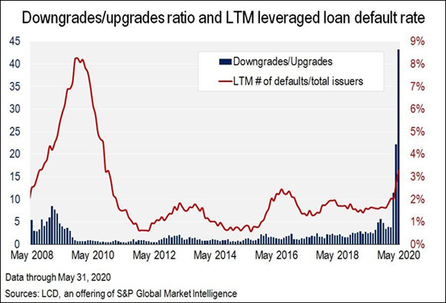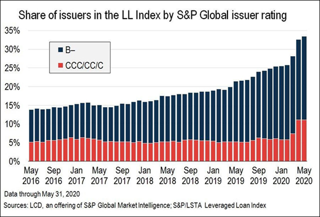 On the following images, we can see the impact of the quarantine measures: the record speed of downgrades by rating agencies, corporate debt almost in 50% in Q1 2020, whilst debt quality decreases (thus, we could see a rise in defaults). According to SP Global, the downgrades that have come are predominantly at the lower end of the rating spectrum, changing the composition of the B- cohort significantly.
