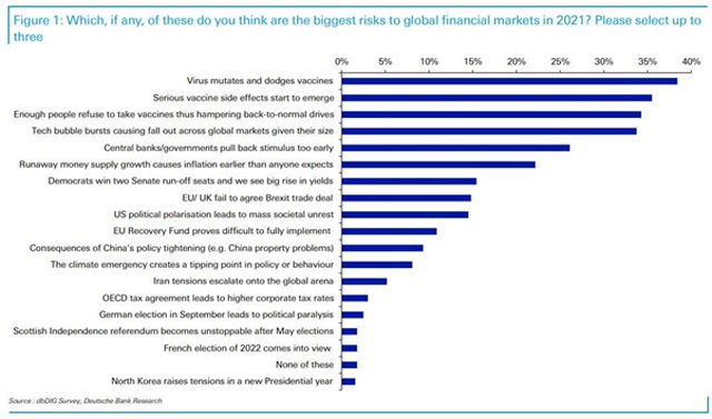 In the last monthly survey, Deutsche Bank asked clients to identify what they “think are the biggest risks to the global financial markets in 2021.” And that is what they came up with: